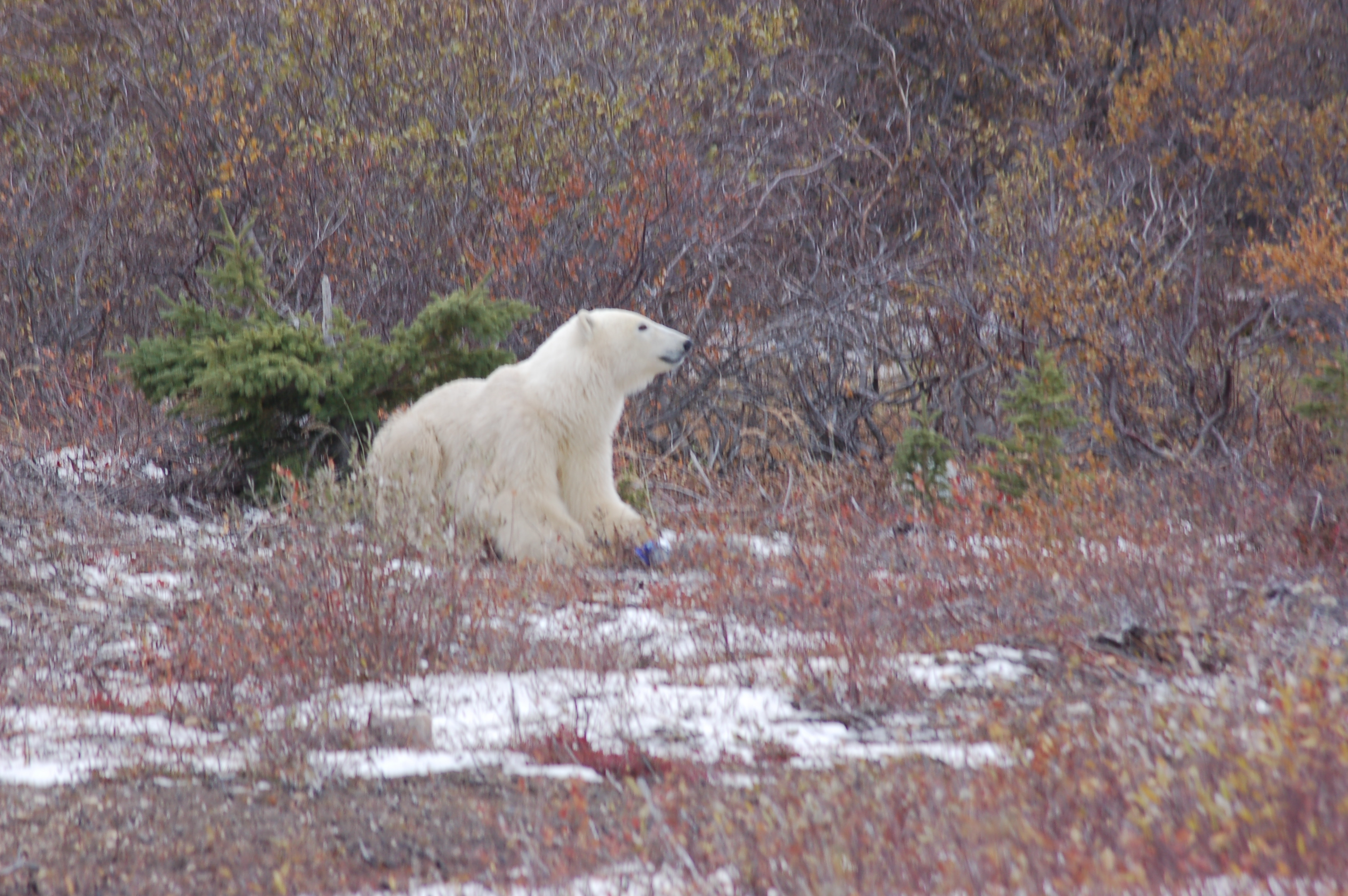 On the land, bear numbers are increasing slightly as the snow and cold creeps in. Guide Sue and her folks covered extensive ground out in the CWMA and crossed paths with nine or ten polar bears. Way out East near ptarmigan Alley, two big male sub -adults lounged about occasionally acknowledging the rover and showing face for good photo’s. Later, after lunch at the tundra lodge, the group had another big male wandering around the rover and glancing up through the grate while sniffing at travelers’ boots.