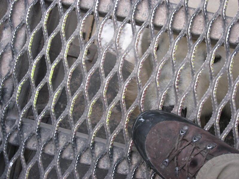 A polar bear sniffs a boot on the back deck of the polar rover. Paul Brown Photo.