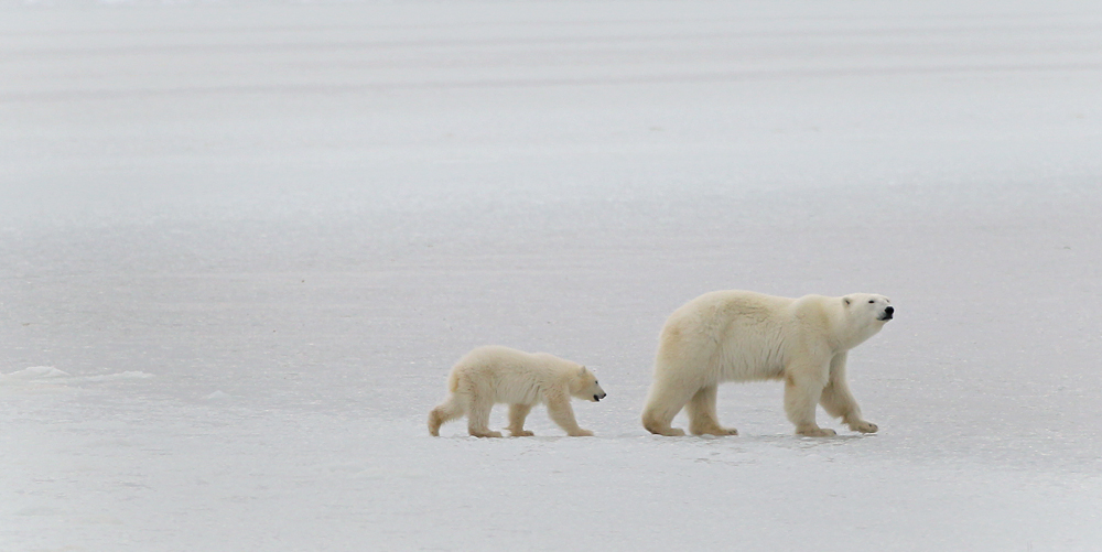 Another high point of the trip came prior to this sighting as the rover covered the trail to the lodge. After encountering two sub-adults close to the trail early on, the group then viewed a sow and cub out on a partially frozen lake in the distance. Because part of this lake thawed earlier in the week, the cub was using it to demonstrate the original “polar bear dip”. As mom dozed contently on the more solid surface, the cub dived under completely at times then reappeared up on the ice, rolling and crawling near mom. Very unusual for this time of the season there normally is almost no open water by this point. Very cool!