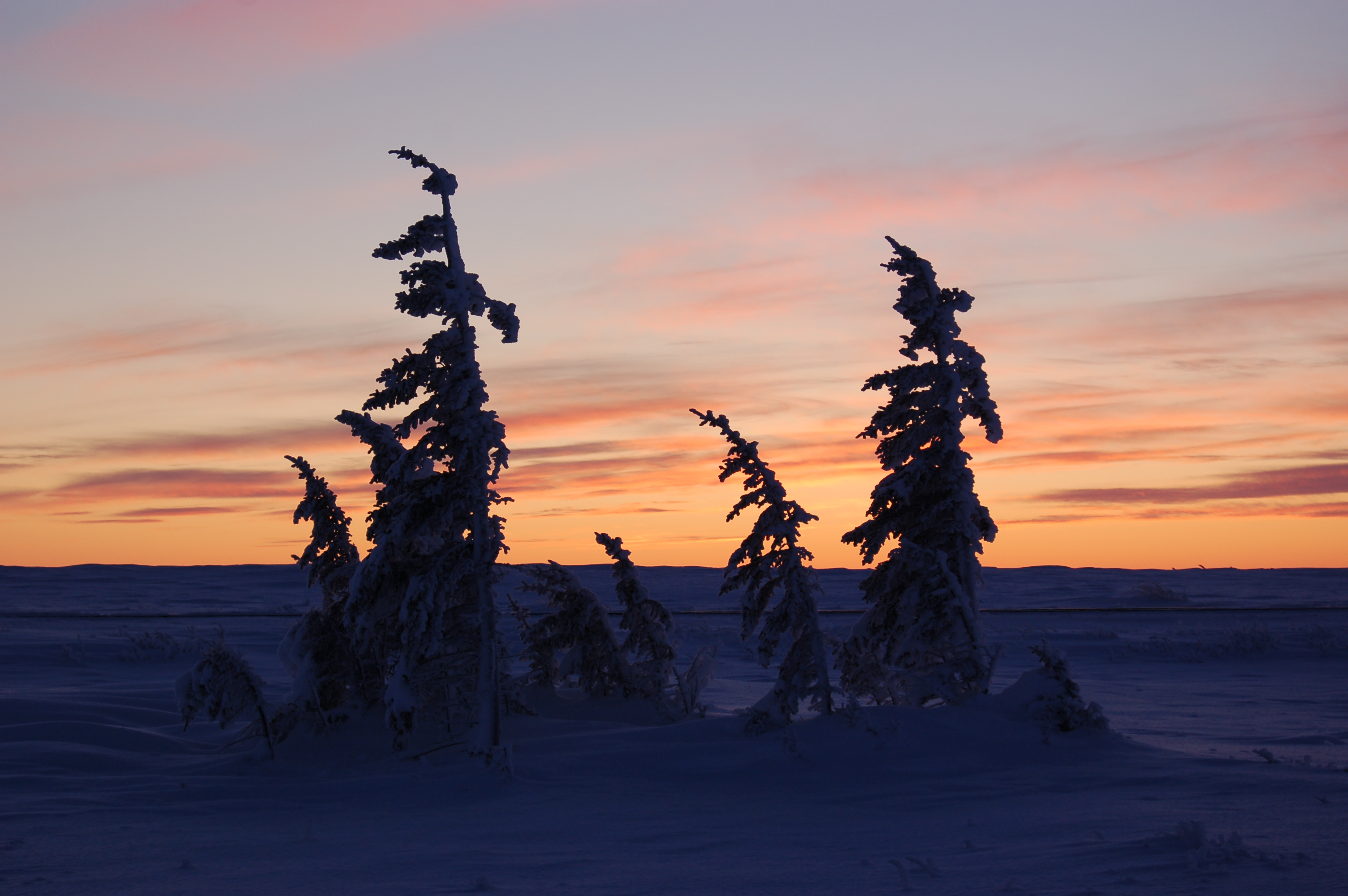 As the group made the trip back to launch, a beautiful sunset filtered through the blowing curtain of snow and ice crystals. The concentric rings of what looked like a giant orange jaw breaker gave the snow a blue tinge and highlighted the flag-like spruce trees. A warm glow in the frigid twilight of the North.