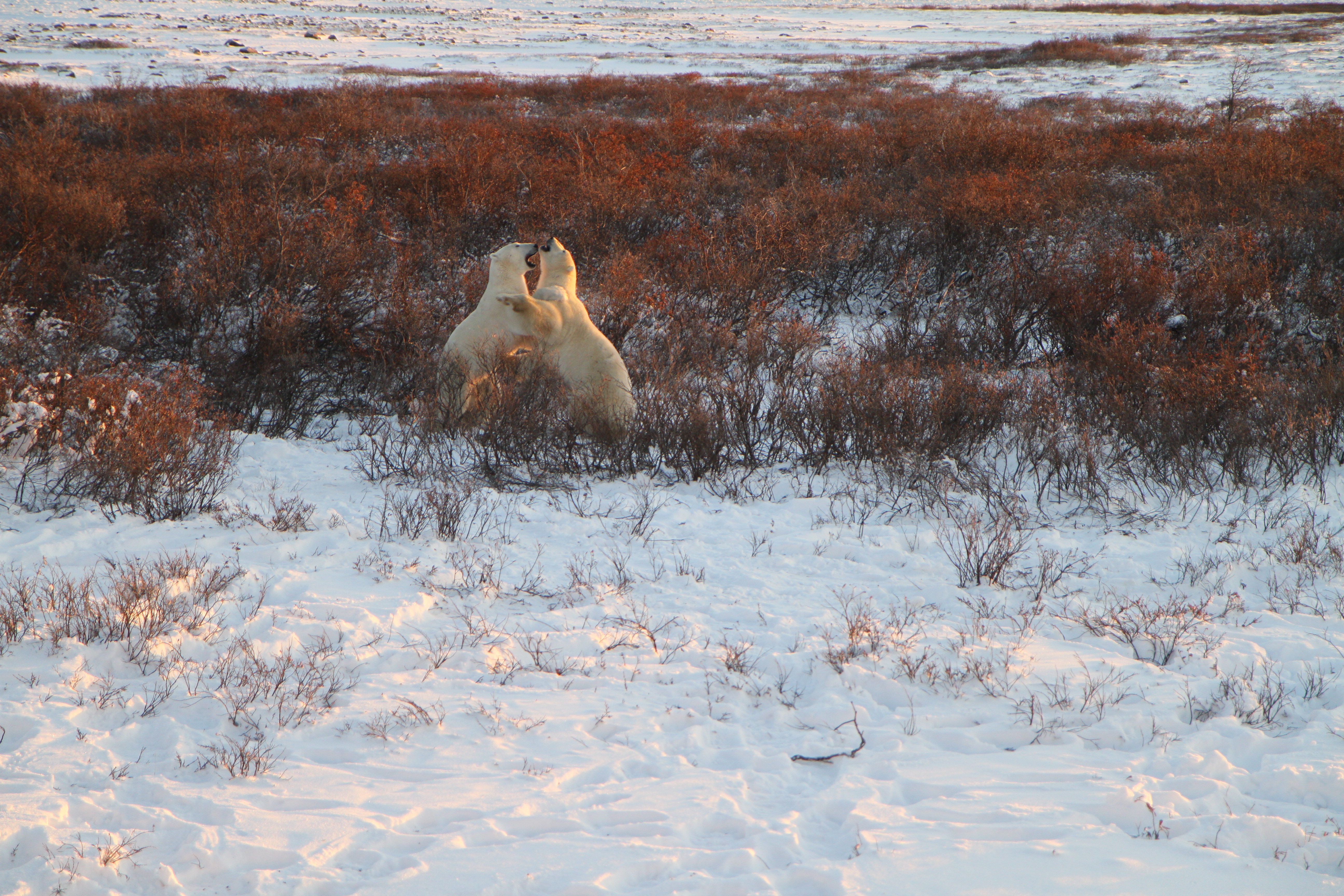 Guide Melissa brought her group to the vicinity of the tundra lodge where frequent sparring thrilled all. In contrast to the mock-fighting, there were also a good number of resting bears scattered in and around the willow stands enjoying some respite from the hammering winds of yesterday. A unique occurrence (at least in the polar bear realm) of a female pushing a male around the area caught the group’s attention. This continued for a good while and then the male finally resisted and pushed the female off toward the coast. Interesting to watch the nuances of territorial interactions. A short time later a couple of younger males became curious and approached the rover, lingering with curious gazes and sniffs to the air.