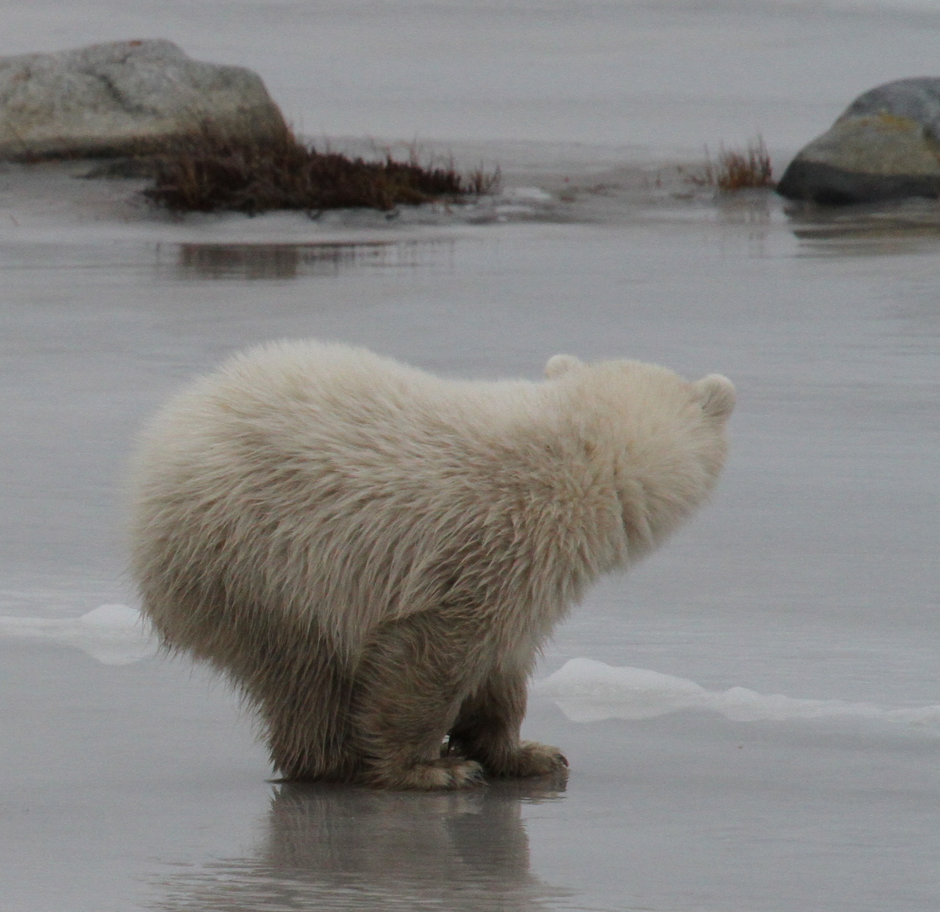 As the morning waned, more bears were spotted moving, though not engaging other bears or rovers as much as other days. Winds were just starting to escalate and the animals were seemingly searching out the prime sheltered locales. Before they reached their spots and before the winds really tipped the scales, the group was enthralled with vistas of bears crossing glass-like frozen thermokarsts (shallow ponds across the tundra). Since temperatures had warmed somewhat in the past two days, the surfaces melted slightly and now had iced up again like a hockey rink. Bears were sliding and slipping a little as they crossed the surfaces. Some bruins were even testing parts of the ice with thumping actions …possibly practicing for later on when the Hudson Bay starts freezing. Observing these bears crossing the ice clearly isolates the pigeon -towed front-leg movements as well as some tentative sprawl-crawl steps taken on seemingly weaker ice. Photographs of all these actions as well as the ones capturing the bear’s reflections on the ice will all be lifelong time capsules of this wild frontier.