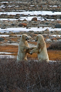 Guide Sue Zajac noticed the polar bears she and her group were observing were “more active” than in the previous days. At the tundra lodge, bears were sparring out on the snow-dusted land, preparing for more serious encounters later out on the ice. After spending a good part of the afternoon in that area the rover headed back toward launch and came across a snowy owl near the trail. Earlier they spotted two golden eagles …most likely the pair that had been seen last week also. Mergansers were scuttling around in the last remaining water of the scattered thermakarsts and a glacuous gull patrolled the coastline riding the up drafts.