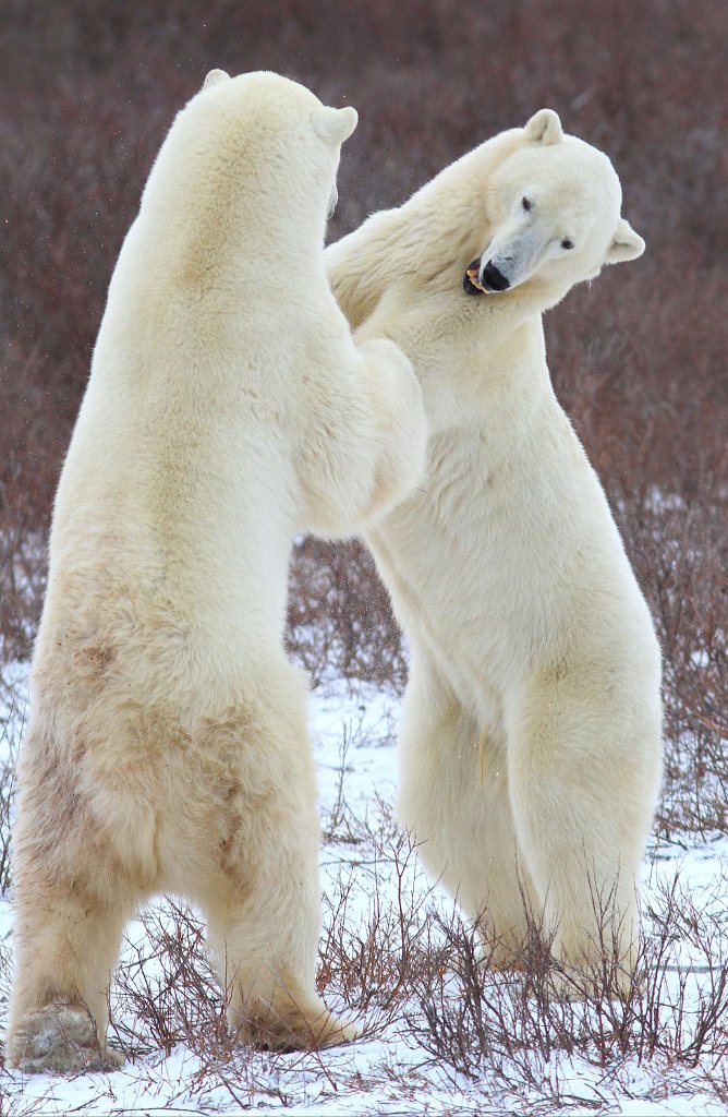 Longtime Natural Habitat naturalist guide Mike Bruscia returned to Churchill after being away a couple of seasons to guide a group around the tundra and this coastal sub -Arctic village. Mike currently is executive director of an kids environmental camp in Charlottesville, VA called the Green Adventure Project. Aside from incredible polar bear sightings, out in the CWMA, the thrill of the day was out at First Tower where a polar bear tried to pick a gyrfalcon off one of the cable supports half way up the structure. Up on his hind legs…the huge torso stretched skyward as Mike’s travelers gasped at the sight. A sow with two coys (cubs of the year) nursing, nine hundred- pound males sparring at the lodge and an Arctic fox finally revealing itself to the group completed an amazing tundra experience. Trifecta!