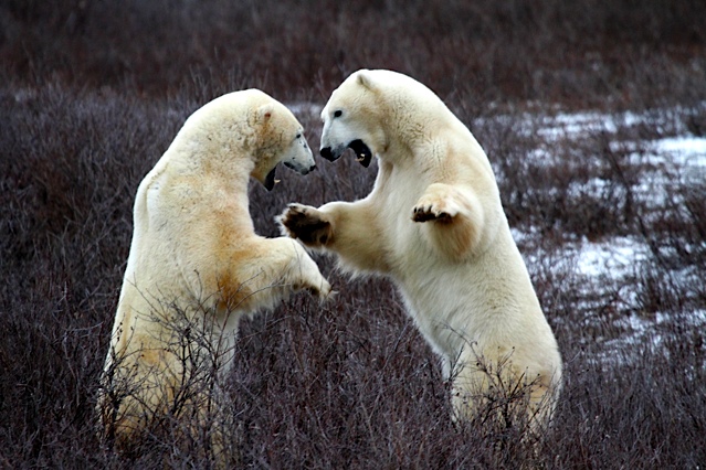 On their night rover trip, guide Sue Zajac and her guests spotted a vibrant red fox against the white covered tundra on their way out to the tundra lodge. Once there, numerous sleeping bears greeted them with indifferent stares. One sat up and another three were soon sniffing at each others muzzles but decided not to tangle…rest time. The group was just off the back deck and they  looked over at the visitors. The animal tracks held the shadows as the glowing sunset filled the chilled air.