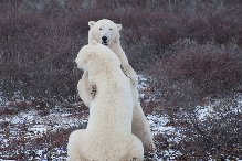 Natural Habitat guide Brad Josephs, who also guides brown bear trips in Alaska, had “the best day of the year” just two days ago. On their initial night in Churchill, the group headed out to the CWMA and were greeted almost immediately by a incredibly curious red fox. They received the same greeting from an Arctic fox the next morning as they ventured out for a full day on the tundra. Arriving at the tundra lodge that morning, the driver situated the rover in the front of the lodge. Soon the action began….two sets of sparring polar bears on either side of the vehicle battled through a heavy snow-shower into subsequent sunlight. Both conditions provided excellent atmosphere to capture the drama on film. Slaps and growls ignited in the chilly Arctic air as the mock fighting became intense and sustained throughout the morning. Brad commented that the sparring was “intense as I’ve ever seen.” And Brad has seen plenty throughout the years around bears.