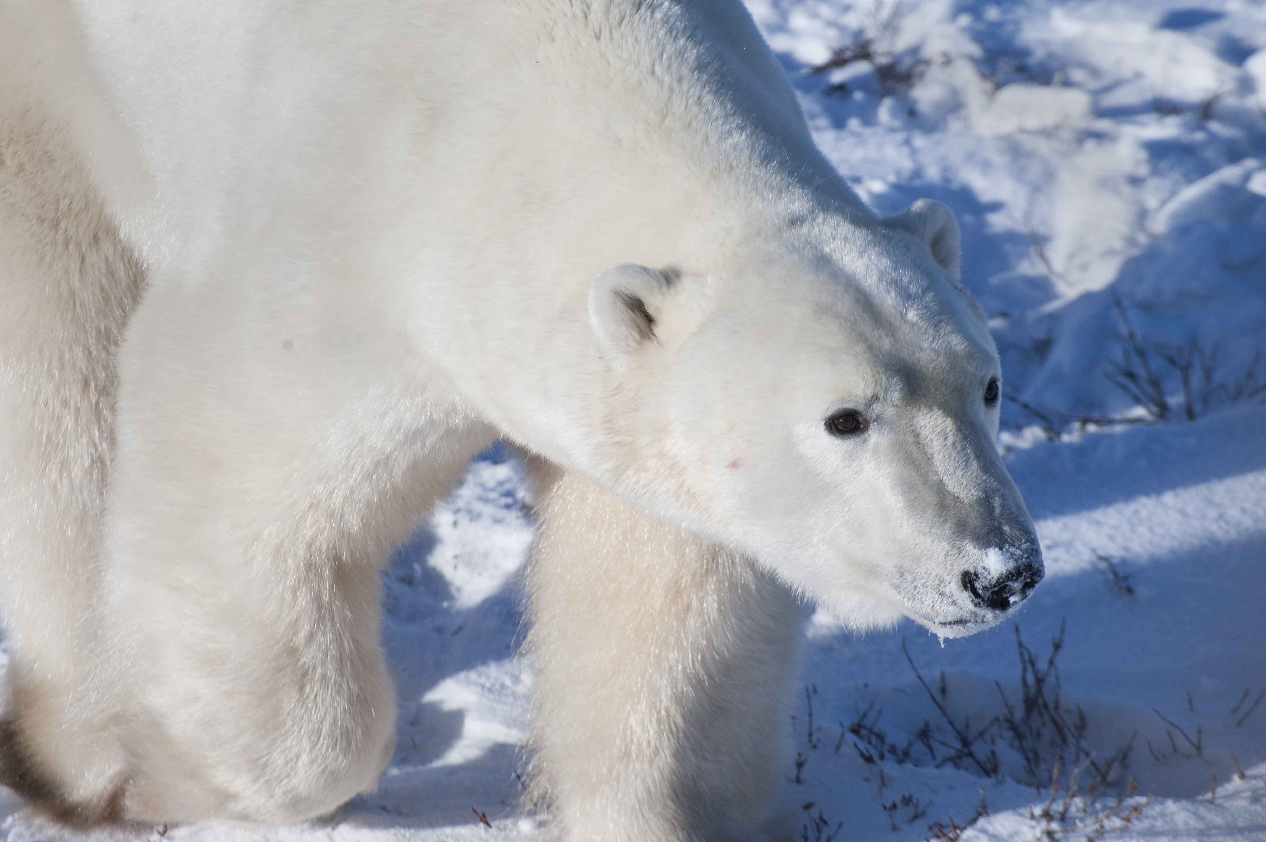 Natural habitat photography guide Colby Brokvist had polar bear action right out of the gate for his avid group of image takers. A sow with her coy were found out on the coast road ambling along the magnificent Hudson Bay. Cameras heated as shutters fired away at the majestic pair amidst frosty conditions.