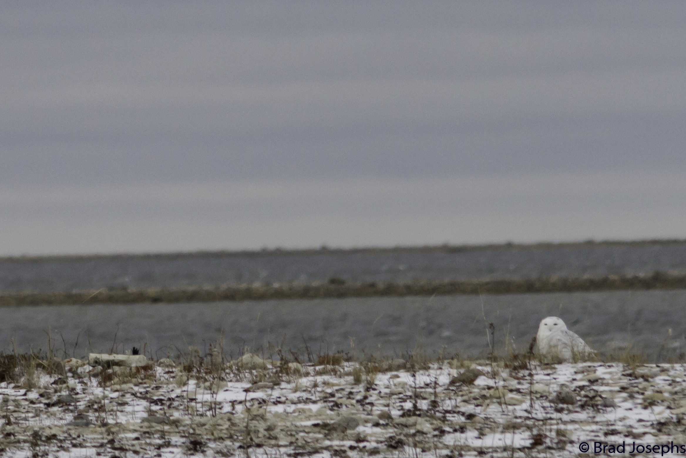 Snowy owl perched on tundra near the coast. Brad Josephs photo.