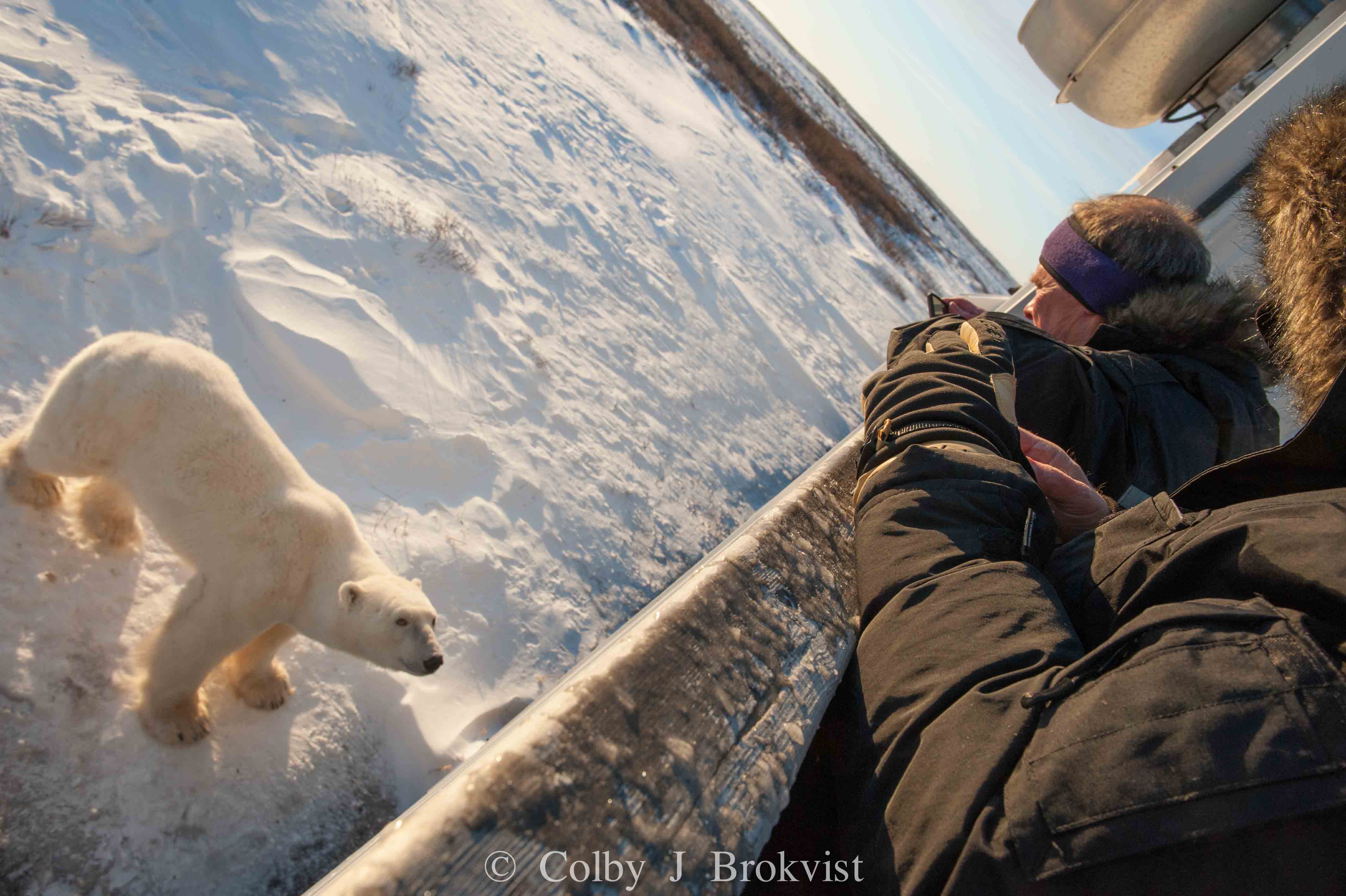 The adventurous start of the journey included getting delayed by a blizzard before charter pilots capably landed in Churchill through a “weather window”. “We arrived to the remote tundra lodge in full whiteout conditions, which really means we got to truly taste what arctic conditions are all about. In the morning we awoke to crisp blue skies, fresh snow, and a big male bear sleeping right outside the window of some of the guest bedrooms. Their first bear was right from their bedroom window!,” reported Colby.