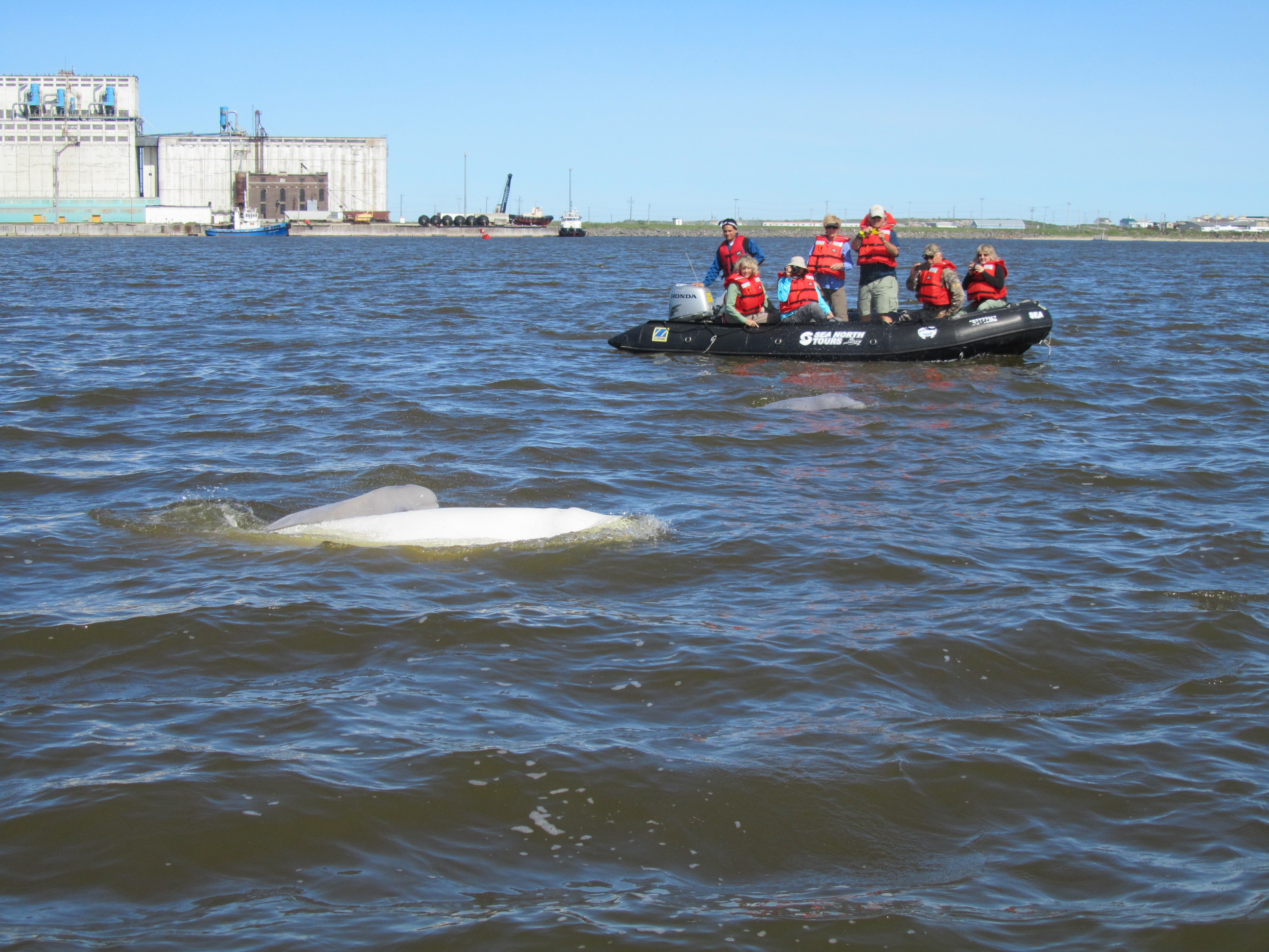 Zodiacs on the Churchill River offer a surface view of beluga whales you cannot get from a bigger vessel where you’re looking down on the whales.