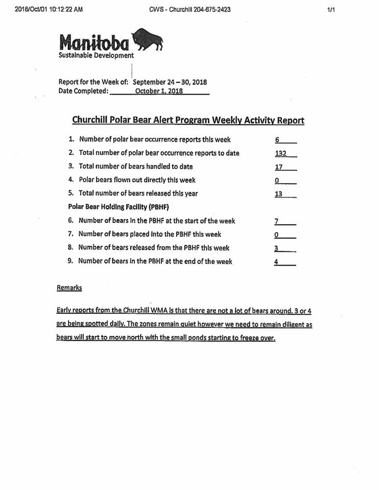 Churchill is pretty quiet at the moment bear wise. A few polar bears are being spotted daily in the Churchill Wildlife Management Area. Small thermokarst ponds have yet to freeze over though once they do polar bears will be moving and heading towards Churchill proper and surrounding area. The polar bear season is just 10 days away and the action will be heating up as the temperatures cool down in Churchill. Stay posted for all the news from the north!