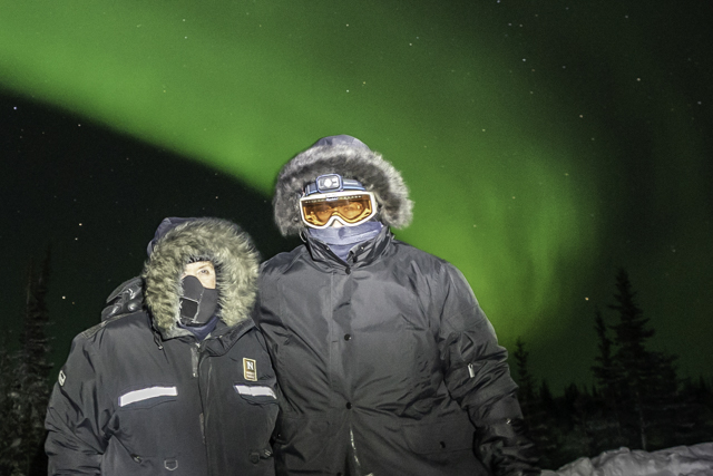 Travelers Phil and Lynne Seymour with an aurora background. I used a split second of light from a flashlight to illuminate them.