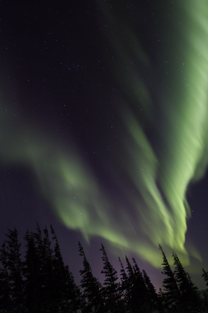 One still from a time-lapse sequence that I have yet to create. This was a super strong display on a kp-5 night. Taken in the boreal forest near Dave Daly’s dog mushing camp. I adjusted the white balance to fluorescent because the original shot was too yellow. I also desaturated it 10 points in lightroom.