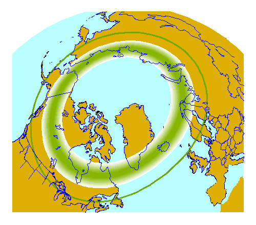This is the band of auroral activity shown by this map, made by the University of Alaska Fairbanks, on an average night. Notice that Hudson Bay is the furthest south extent of the band.