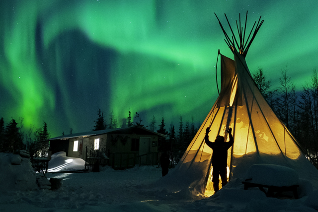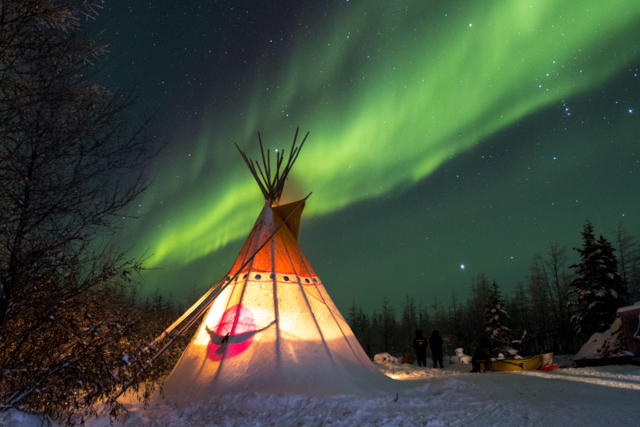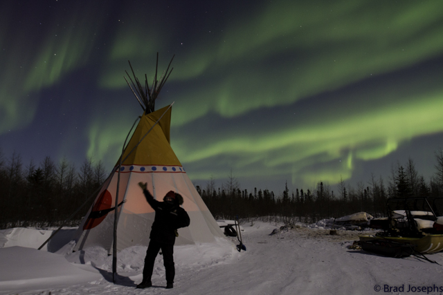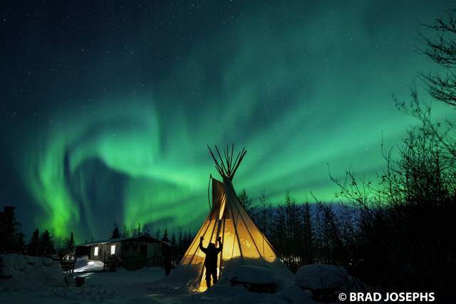 Aurora over a traditional Metis teepee outside of Churchill at Dave Daly’s dog mushing camp (Wapusk Adventures.)