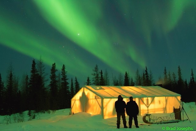 Myself and Jim Floyd self-portrait in front of a cozy dog mushing tent in the Boreal forest outside of Churchill on a frigid night.