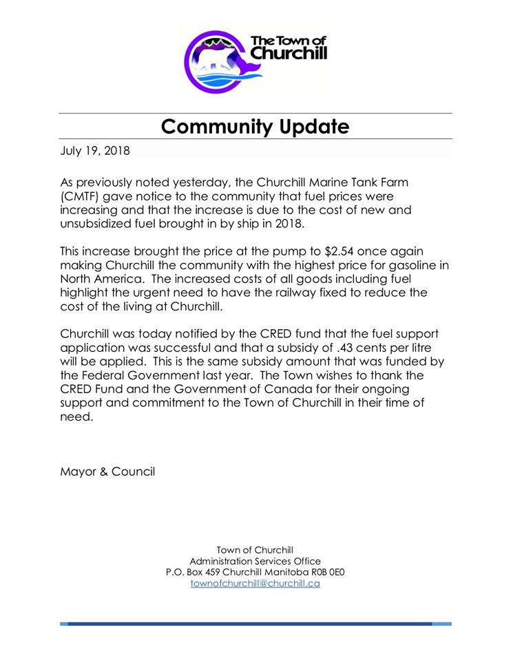 Some relief is here for Churchillians as the Government of Canada has approved a .43 cent per liter subsidy for fuel supplied by the Churchill Marine Tank Farm. Although there is some resentment still towards Omnitrax, the current owner of the tank farm, residents feel fortunate to have the discounted fuel. Churchill currently has the highest price per lite/gallon of fuel in North America!