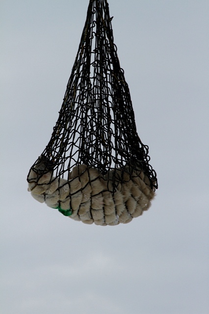 A polar bear is lifted via helicopter from the holding facility.