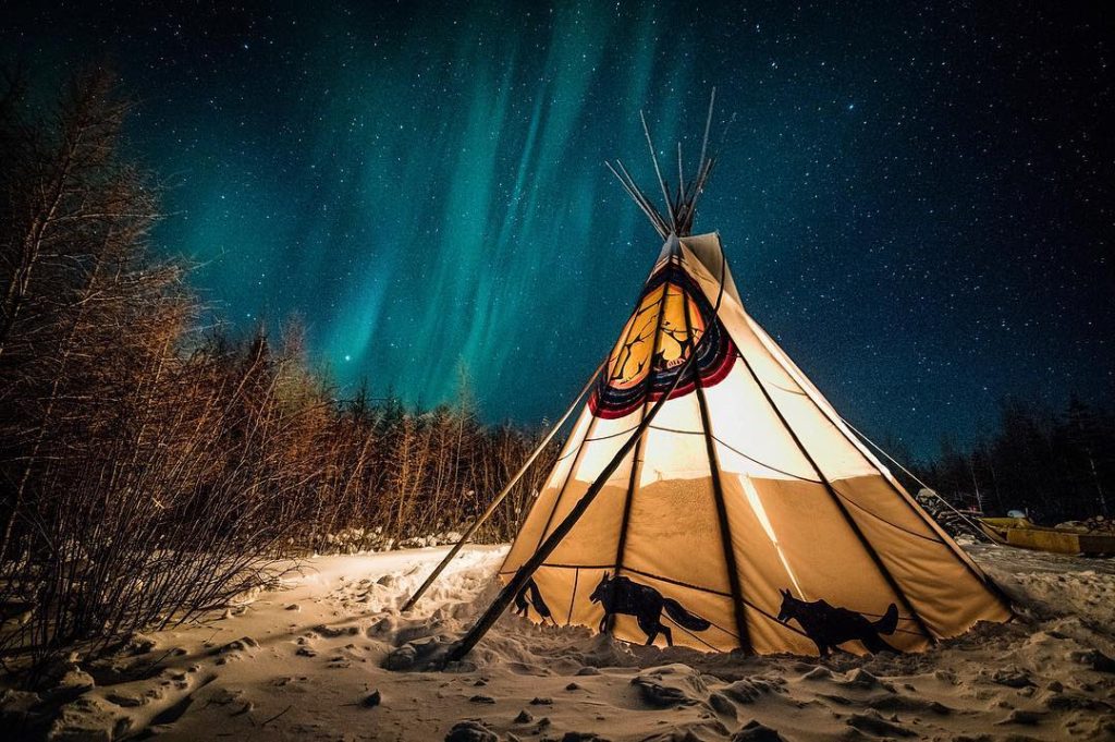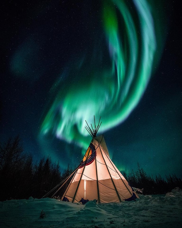 Northern lights flooding the sky above tee pee at Wapusk Adventures in Churchill. Andre Brandt photo.