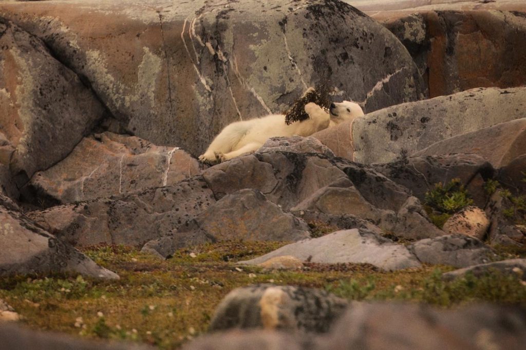 A lounging polar bear plays with some kelp on the Precambrian shield by the Hudson Bay in Churchill. Bears are patiently waiting for the fall polar bear season when the Hudson Bay will slowly freeze-up and seal hunting season will begin!